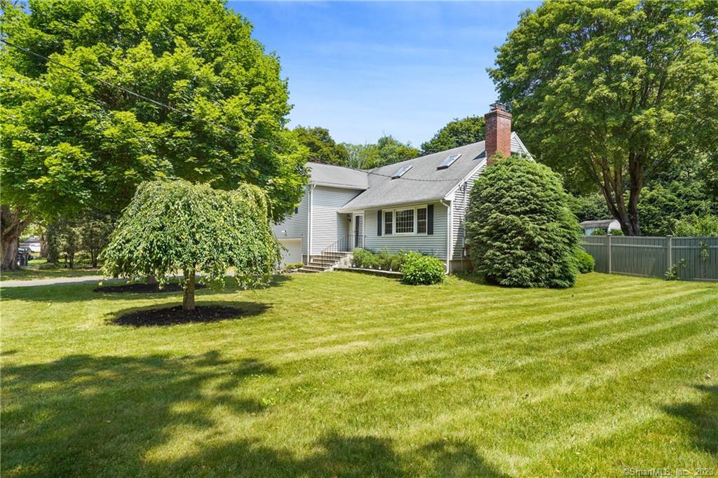 Nestled on a cul-de-sac, this residence is on a generous, nearly half-acre plot of lush, level land primed for occupancy. The main level boasts an open floor plan, highlighted by a generously proportioned living room with a wood-burning fireplace and a magnificent wall of windows, infusing the interior with abundant natural light. Gleaming hardwood floors add a touch of elegance to the space. The updated kitchen features granite countertops, a spacious island, and stainless-steel appliances seamlessly flowing into the dining room, opening to the rear deck (28'x16'). Just off the kitchen, a few steps lead down to the inviting family room, where glass doors unveil a rear terrace and an expansive fenced backyard. On the second floor, a well-appointed hallway leads to the extensive primary bedroom, complete with an en-suite bathroom, walk-in closet, and two additional bedrooms with a shared bath. The third floor, has natural light from skylights, with a fourth bedroom and a versatile office or sitting room, adding 566 sqft of living space. The lower level of the home has an unfinished basement, laundry facilities, utilities, and ample storage. The property is complete with a heated and air-conditioned two-car garage. The yard exudes charm, with breathtaking views of the sprawling, rear lawn from the back deck and terrace. Located on Weeping Willow Lane, this residence offers proximity to Fairfield's amenities, including dining, shops, the train station, and the Merritt Parkway.